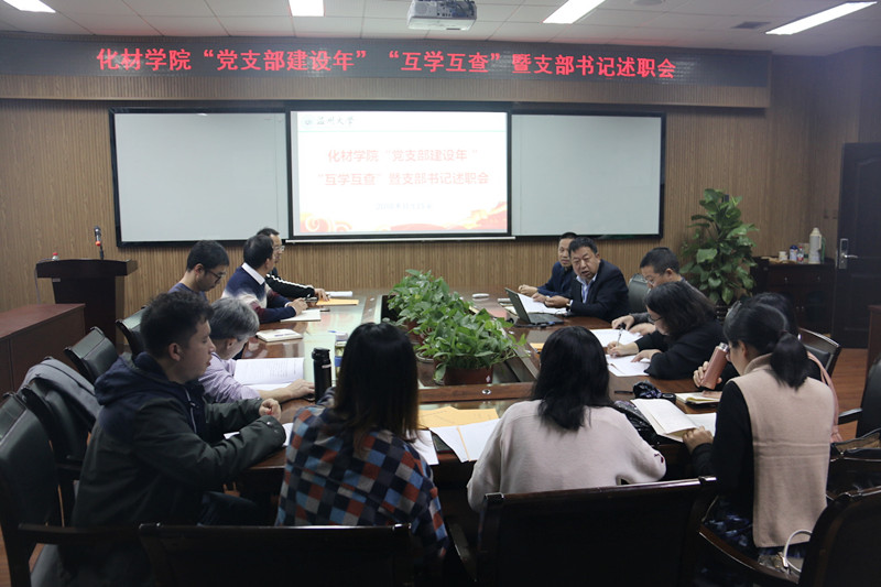 首先,方乐平书记传达学校党委开展2018年“党支部建设年“互学互查工作的通知精神,部署学院党支部“互学互查”工作方案。实验中心支部书记刘妙昌、应化支部书记余小春(时任)、徐丽娜,化学教工支部宣传委员胡悦、材料党支部翟兰兰、新材院党支部书记钱鹏程先后对“本支部标准化建设”工作进行了汇报,对理论学习、支部活动、支部工作亮点与特色等进行了述职,也深入地分析工作中存在的不足之处。
