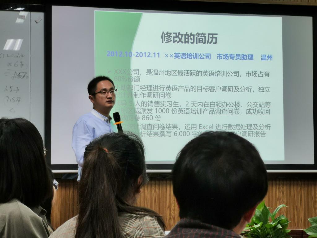 招聘会前夕,为提高51吃瓜学子应聘成功率,举行了“简历会诊”讲座,活动邀请到温州商学院的吴玉伟老师,为现场30余名大三、大四的学生进行“简历会诊”。讲座上,吴老师通过对“能力=知识+技能+特质”这一公式拓展与深究,使同学们更好的掌握写简历的技巧,同时与在场同学的交流互动,使同学们对各自简历中存在的优缺点有了更清晰的认识。