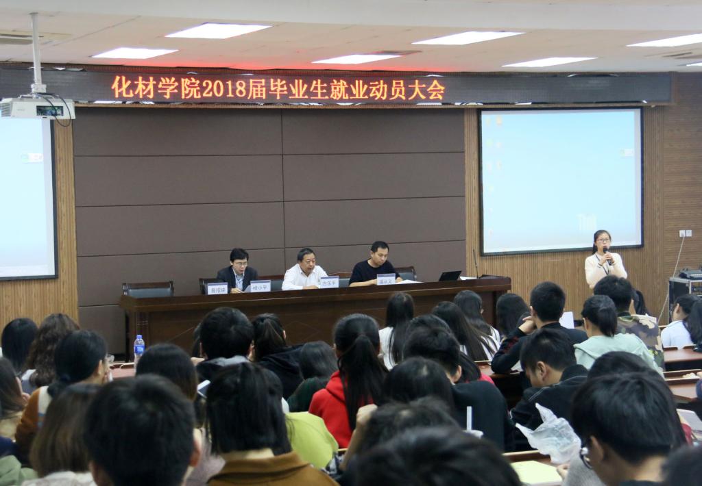 在化材楼11C-401室召开了2018届毕业生就业动员大会。学院党总支书记方乐平、副院长杨小平、党总支副书记出席大会,2014级本科生、2015级研究生参加了本次大会。大会由学生科副科长易招娣主持。