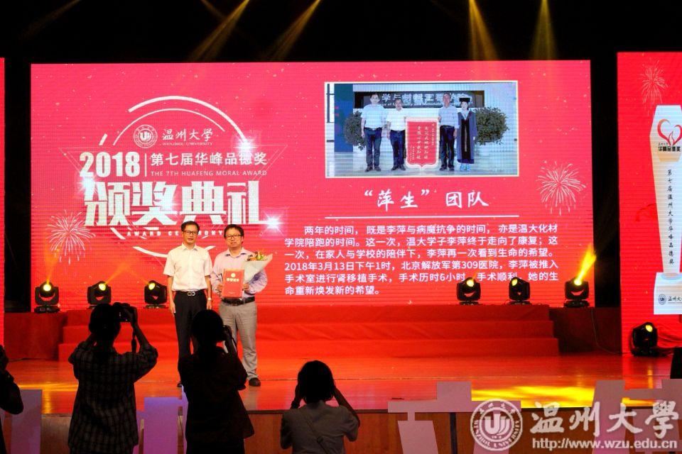 13级化学专业研究生2016年初诊断出尿毒症晚期,得知病情后,学院杨植(导师)、陈锡安(班主任)、方乐平、潘从义、邹涌彬等老师积极组织发动募捐30多万帮助度过病情危险期。2016年李萍病情稳定后在家休养依靠血透维持生命,杨植、陈锡安老师定期沟通支持鼓励,悉心指导李萍科研学习,帮助她坚持顺利完成科研成果和毕业论文完稿。2017年1月后李萍病情恶化,需要尽快肾移植手术才能挽救她的生命,得知李萍父亲准备捐肾救女但是医药费没有着落,“萍生”团队老师马上组织学校师生校友、联系社会媒体,在一周的时间里募捐到30余万元,帮助李萍顺利进行移植手术,现在已经出院进入康复期。今年三月“萍生”团队老师到医院探望李萍,鼓励和支持她养好身体,四月李萍参加论文答辩,并于六月返校参加毕业典礼,迎接新的人生。