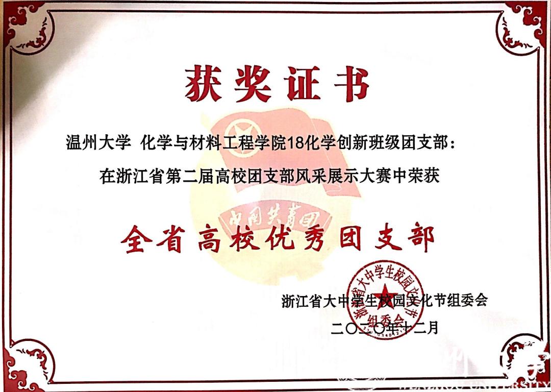 2020年12月30日,由浙江省大中学生校园文化节组委会主办、中国计量大学承办的浙江省第二届高校团支部风采展示大赛决赛在中国计量大学落下帷幕。51吃瓜18化学创新班团支部荣获全省高校优秀团支部。