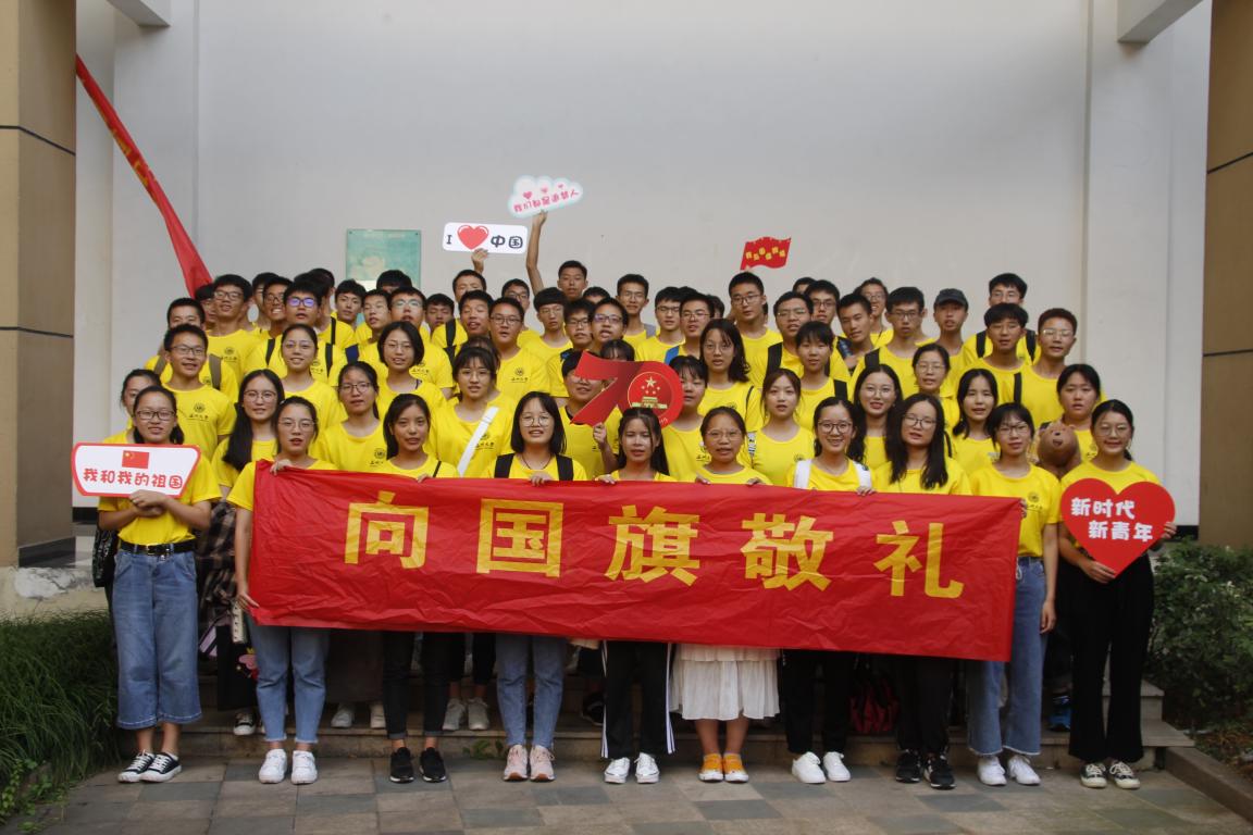 的学生们挥动手中的国旗,共同为祖国庆生!