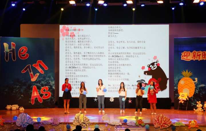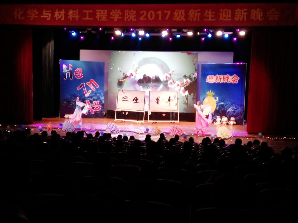 胡悦、钱金杰、刘楠楠等三位老师组成chem3组合,用化学名词串成的《歌曲串烧》,真诚地欢迎新生的到来。