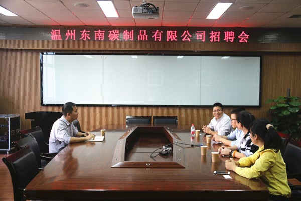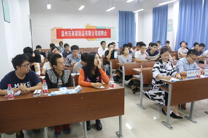 顺利召开。出席本次招聘会的有温州东南碳制品有限公司副总经理金方义,主管郝书亭以及校友陈丹丹,沈官宏。来自化材,生环以及物电等学院的数十位学生参加了本次招聘会。