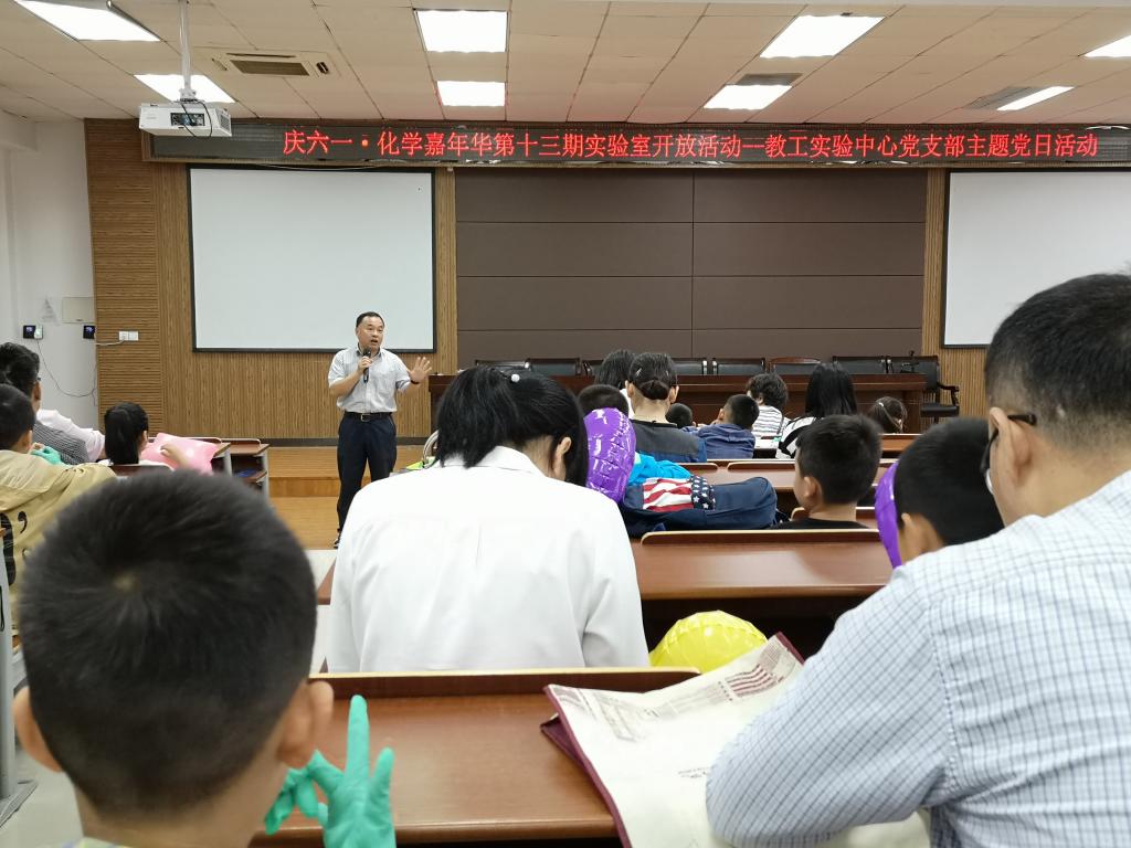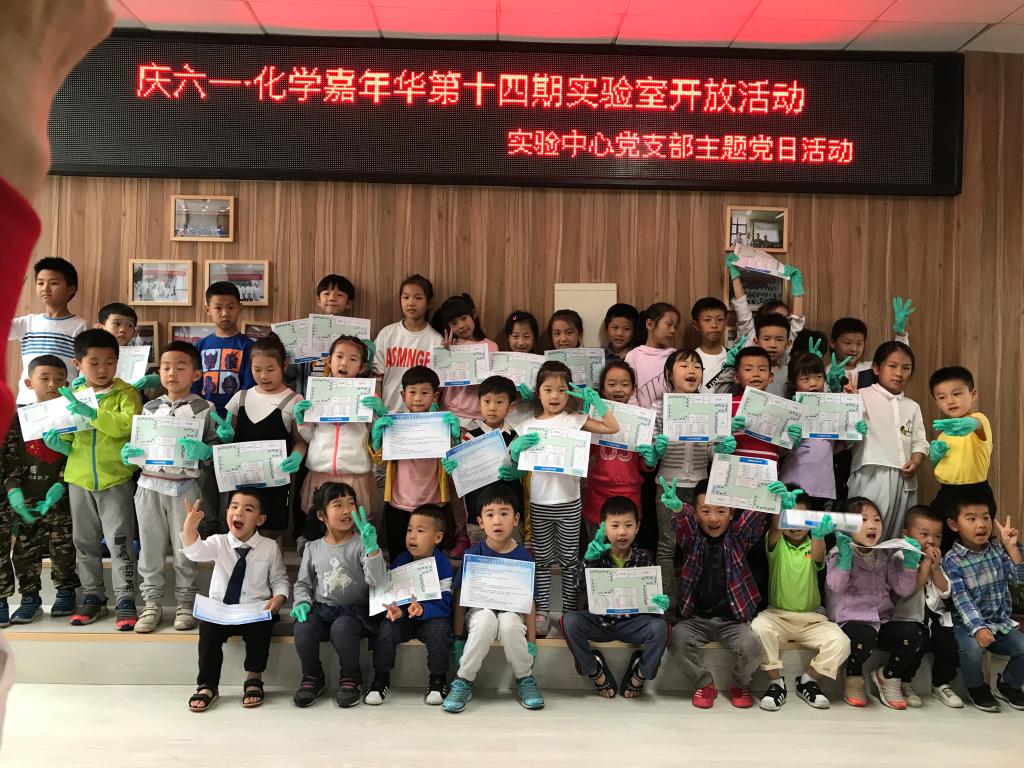 教工实验中心党支部第十四期实验室开放日活动,邀请学校教职工子女进入实验室体验生活中的化学,为小朋友们送上”六一”儿童节礼物。当天上午,校工会主席张希均老师、学院党委书记方乐平老师、化材学院党委副书记潘从义老师、学院工会主席陈锡安老师、实验中心教工党支部书记刘妙昌老师及其支部党员教师与大学生志愿者来到现场。