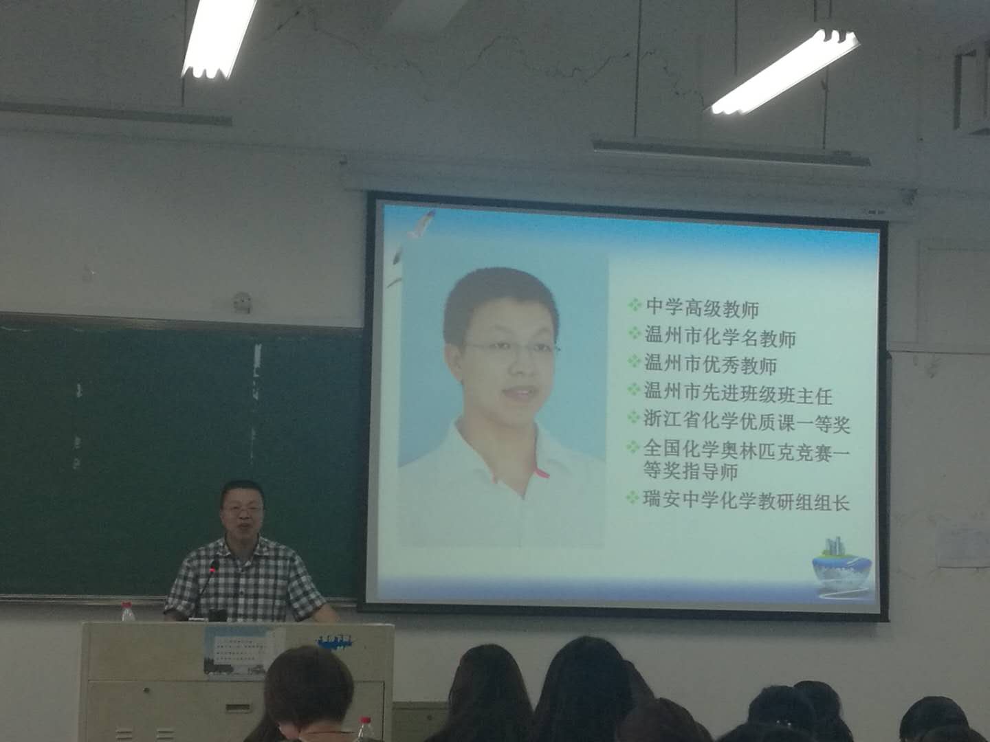 讲座内容主要包括三个方面:一、温州市中小学学科教研组建设指南。徐老师强调优秀青年教师的养成和教研团队的合作精神;建议新教师教案书写要落实学科核心素养并加强拓展性(选修)课程的开发。二、瑞安中学“十三五”发展规划。徐老师鼓励同学们做到爱好广泛,一专多能。徐老师还提到“云数据”、“大数据和证据对考试分析的研究和评价”等开拓眼界的知识。三、对标分析。徐老师介绍了瑞安中学同温州中学的对标中找出各自的优缺点,要同学重视教师素养,告知同学“首先要确立自信,化学教师的能力主要体现在“教学”、“竞赛”上;徐老师重点说明了高中化学对“竞赛教练”的迫切需要。他还强调学科教学要“教学细节”与“学术理念”并重,既要学习对方的具体做法,也要学习对方的学科思想。最后他用“看清自己的内心,看清自己的需要,坚信自己的信仰,努力下去,必有回响”结束了本次讲座。