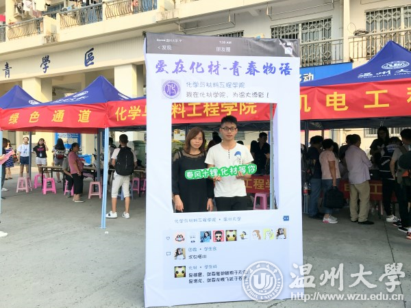 来自17化本班的林同学说:“报到第一天,我真的被学院创意的合影框惊到了,‘春风十锂,化材等你’‘氢春有你’‘钠么美好’等带有化学元素的祝福语洋溢着青春活力又充满了浓浓的化学情。新加入的“化材新元素”们深切感受到来自51吃瓜