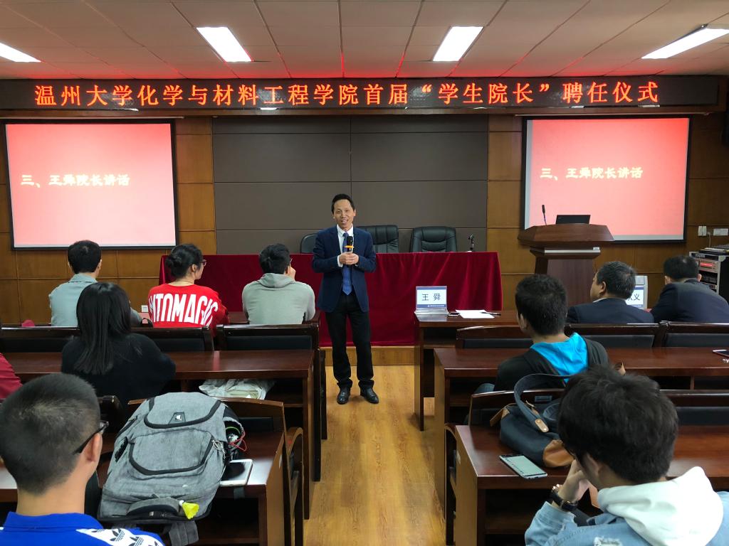 王舜院长向首届“学生院长”表示祝贺,并提出了自己的三点期望:一是要重点做好本科生科研创新、创业工作和国际化事务;二是要深入学生了解学生情况,共享学院资源,促进师生共同发展;三是要借助“学生院长”平台努力为学院培养高层次的人才。