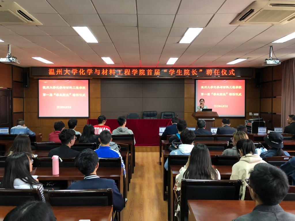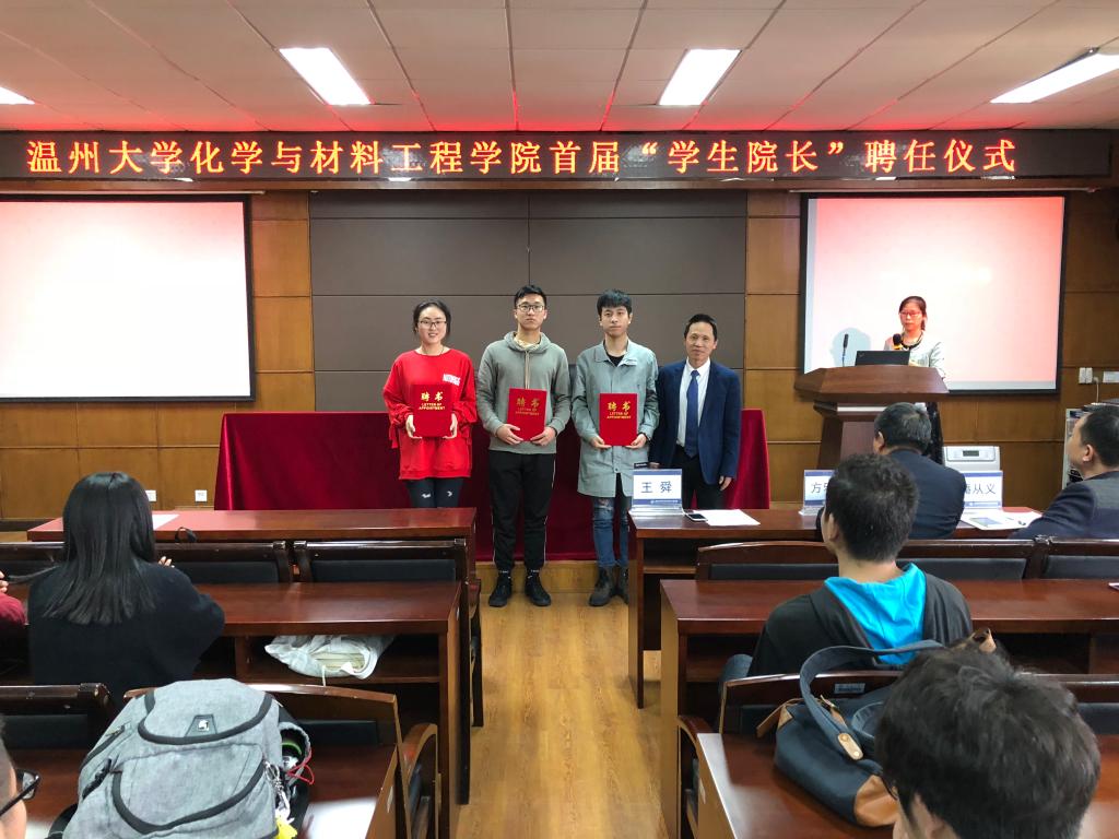 首届“学生院长”聘任仪式于化材楼11B208会议室举行。出席此次聘任仪式的有学院院长王舜老师、院党委书记方乐平老师、副书记潘从义老师、辅导员邹涌彬老师,“学生院长”与“学生院长团”成员以及大一至大三的各班班委骨干。会议由学生科副科长易招娣老师主持。