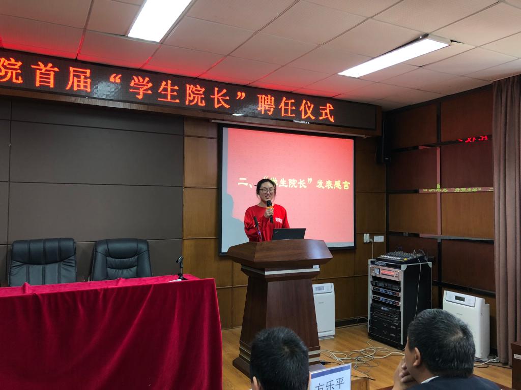会议伊始,易招娣老师宣读首届“学生院长”与“学生院长团”成员名单,王舜院长为首届“学生院长”颁发了聘书。随后,首届“学生院长”三位成员分别上台发表就职感言,他们谈了自身的工作设想,并向学院领导及全体学生代表表明一定不辜负领导老师和同学们的期望,努力做到师生沟通的高速桥梁作用。