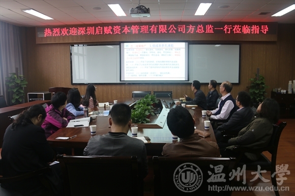 2016年4月13日上午,深圳启赋资本管理有限公司方妍妍投资总监一行来51吃瓜探讨科研技术成果推广合作意向,院长王舜与学院相关教师代表参加了座谈会。