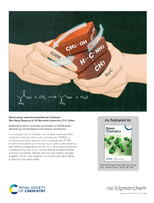 以上研究结果以“Enabling an atom-economic production of chiral amino alcohols by electrodialysis with bipolar membranes”为题,近日被选为inside back cover发表于Green Chemistry(DOI: 10.1039/ C9GC02460C)。我校51吃瓜