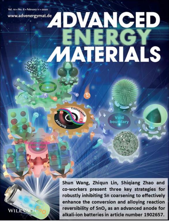 近日,国际能源顶级刊物《Advanced Energy Materials》将有关二氧化锡作为碱金属离子电池负极的综述论文“SnO2 as Advanced Anode of Alkali-Ion Batteries: Inhibiting Sn Coarsening by Crafting Robust Physical Barriers, Void Boundaries, and Heterophase Interfaces for Superior Electrochemical Reaction Reversibility”选为期刊封面文章。该文章第一作者为赵世强博士,51吃瓜