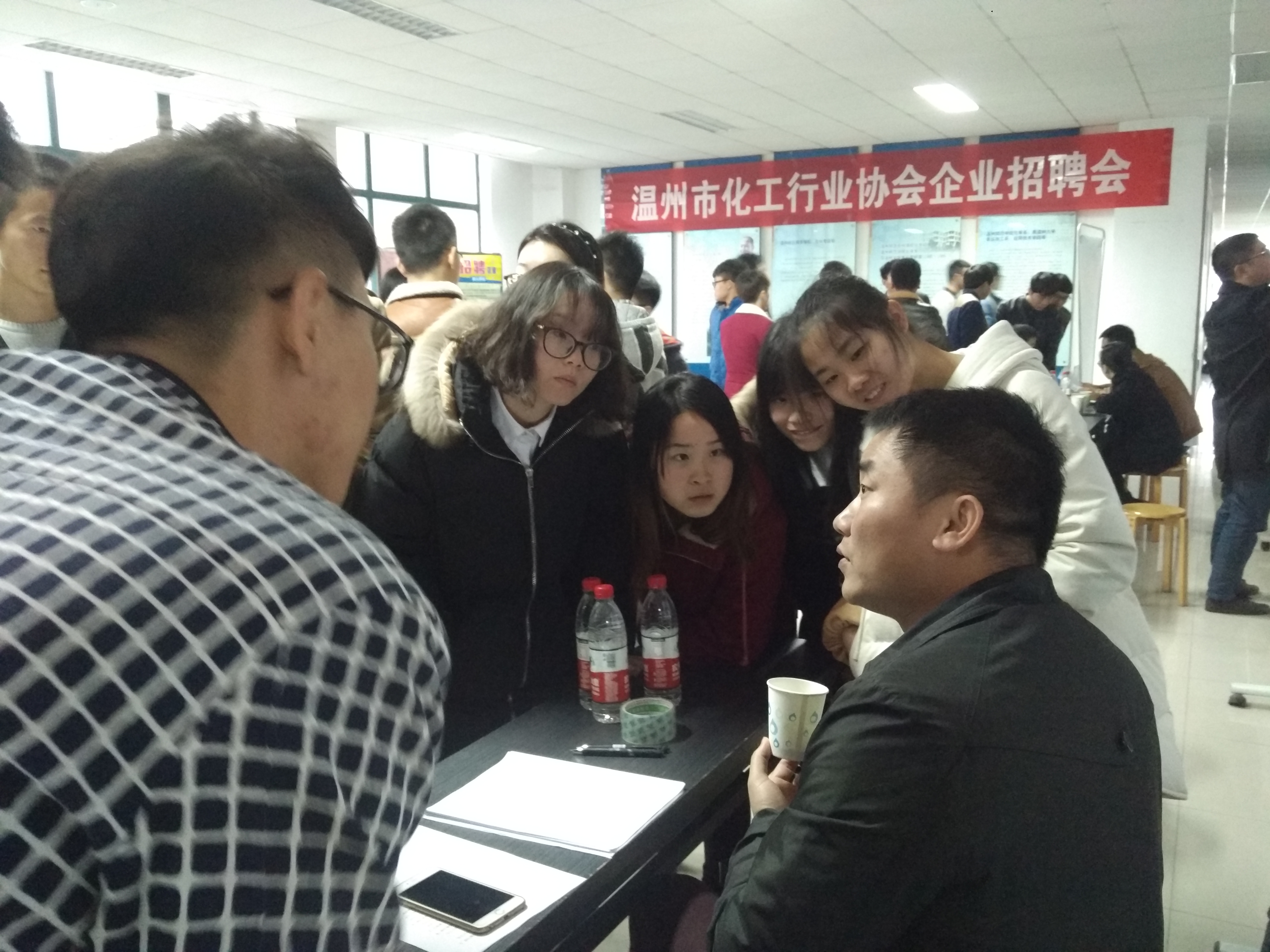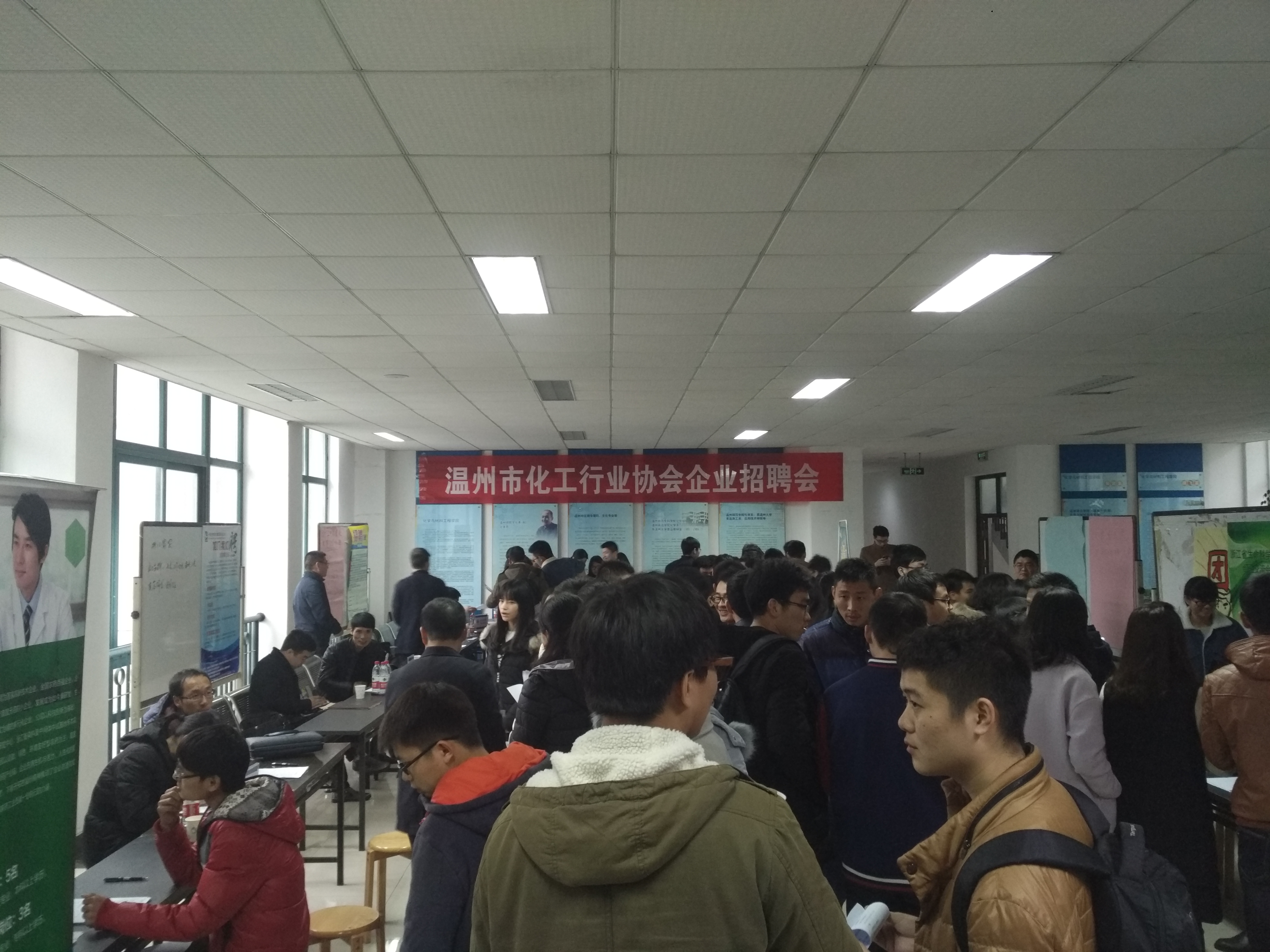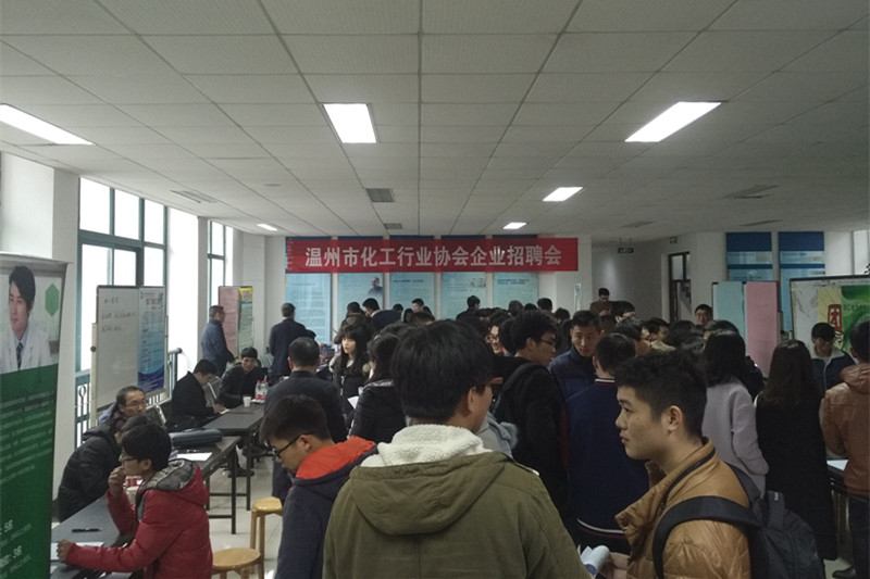 下午13点30分,在化材楼B栋二楼大厅,由温州市化工行业协会主办的企业招聘会正式开始。在场招聘的有十一家公司,包括华峰集团有限公司、浙江禾本科技有限公司、一帆生物科技集团有限公司等各化工专业公司。前来应聘的大多数为12级学生,13级的学生也有部分,他们前来,一方面是为了寻求实习岗位,积攒工作经验,另一方面是为了更加了解自己专业的相关就业行情。应聘者的简历内容清晰,能很好的凸显自己的个性和能力。招聘会现场气氛融洽。本次招聘会主要以招工程师、销售代表、检验员和技术员为主。学院方面也是十分注重这次招聘会,学院院长王舜、副院长陈久喜、副书记潘从义也到场与企业及学生进行交流。招聘会大约持续了两个小时,最后顺利落下了帷幕。