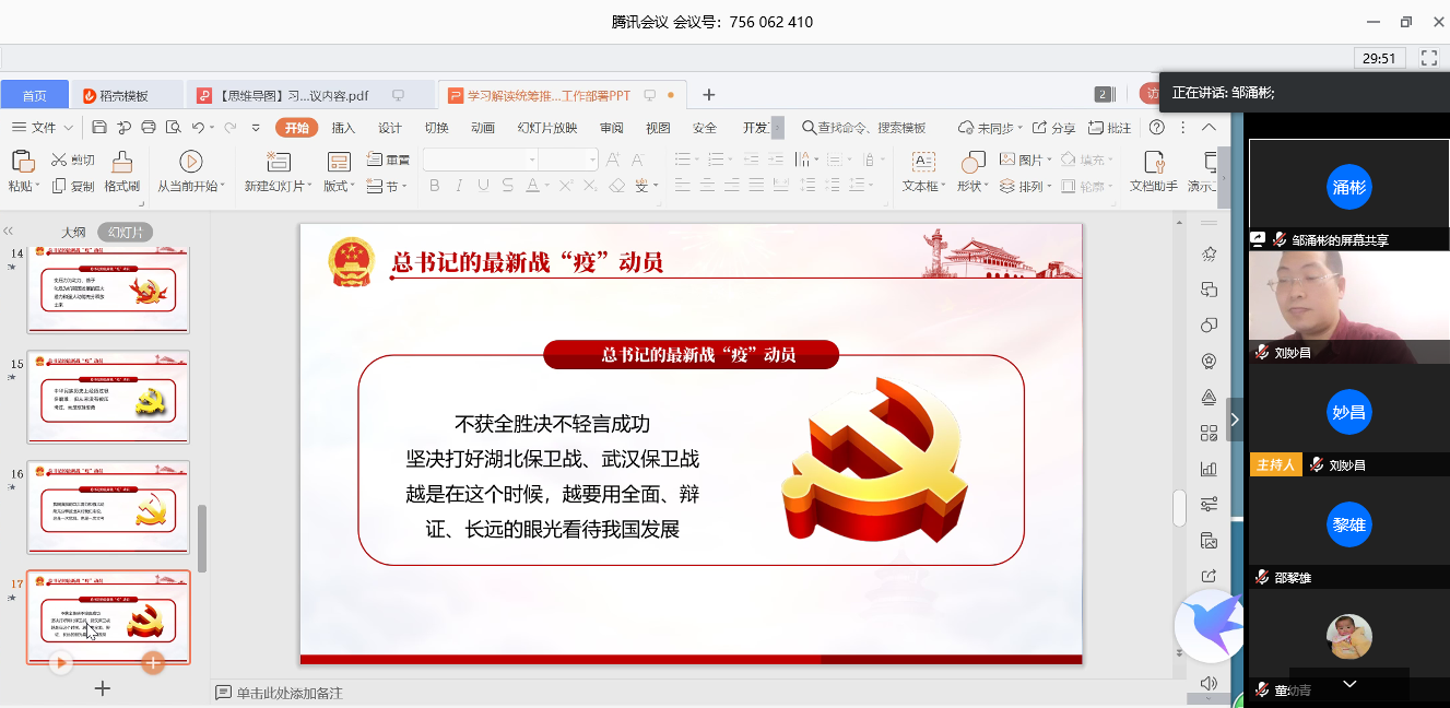 当前疫情形势依然严峻,防控到了最吃劲的关键阶段。为进一步发挥党支部战斗堡垒作用和党员先锋模范作用,凝心聚力、共同抗“疫”,3月21日实验中心党支部,利用腾讯会议网络平台,在线开展了“抗疫情、促发展、当先锋””主题党日活动。