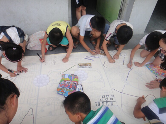 下午,开展大地画活动。队员们先准备好颜料、马可笔、绘画素稿和长画布,然后队员们和小朋友们一起勾画在画布上并上色。天气很炎热,但队员们都非常细心地指导小朋友们勾勒和上色,小朋友们也一脸认真地画画。经过一下午的绘画,队员们和小朋友们完成了一幅主题为人身安全且色彩丰富的长布画。看着自己的巨大作品,小朋友们都一脸成就感,非常兴奋和开心。