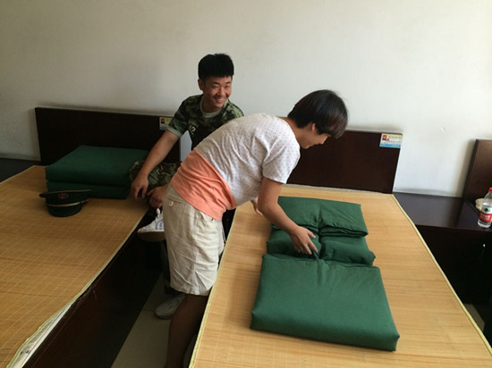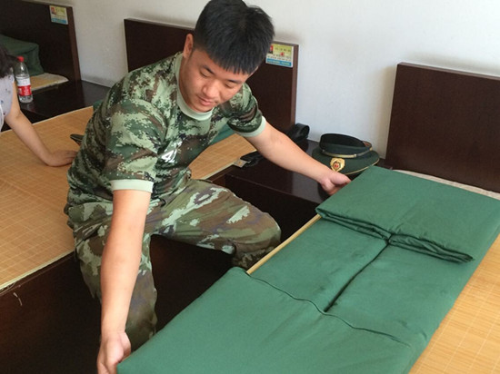 早上9点整,在消防官兵的指引下,队员们参观了班排宿舍,面对叠得像“豆腐块”一样的被子和整齐划一的衣柜,他们无不惊叹部队的严肃和正规,在队员们的要求下,消防官兵还现场演示起了叠被子的过程,他边叠边回忆起当初叠被子的“心酸史”,其实军被一开始并不是像现在这么硬实平整,都是最早用凳角压出来的,要花至少一周的时间反复压,才有现在的效果。消防官兵首先是把被子分成四块,两边的往中间叠,再把两个双层的叠一起变成一个四层的长条形,再又分成四块往中间叠,最中间要稍微宽一点,叠完之后,消防官兵强调了叠军被的秘诀是三分叠,七分整,所以叠完后的整理才是至关重要的。终于叠完了,队友们看着跟豆腐块一样的军被问起了叠被子的秘诀是什么,消防官兵笑笑说了句,很简单,贵在坚持,这简短的一句话引得队员们发出阵阵感叹。