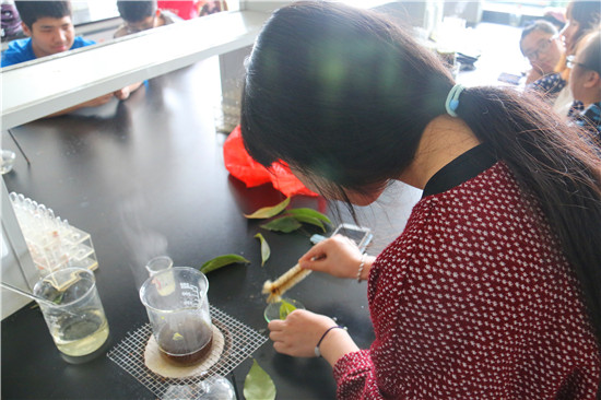 活动开始,孙姁洁介绍了如何制作叶脉书签:先将树叶浸泡在热的氢氧化钠溶液中,待叶肉完全泡烂,用即可用旧牙刷轻轻刷去叶片表面的叶肉,待叶肉除干净,此时,叶脉书签已基本成型,最后将叶脉书签浸泡在双氧水中一段时间,拿出晾干即完成作品。介绍完毕,会员们都各自寻找仪器开始进行制作。