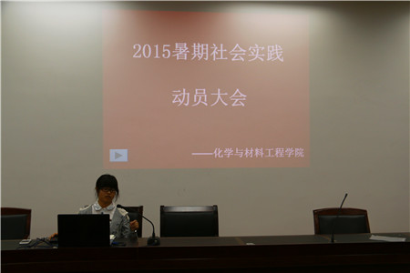 大会一开始,主持人寿丽莎(创新实践活动中心干事)简明扼要地说明了暑期社会实践活动的目的和意义,同时也向在座的同学们介绍了暑期社会实践活动的八大基本主题,这八大基本主题分别是爱心类、政治类、支教类、环保类等;暑期社会实践的基本流程,大致分为策划征集,学院三轮答辩,确立学院实践队伍,出征仪式和实践开始这几个步骤。