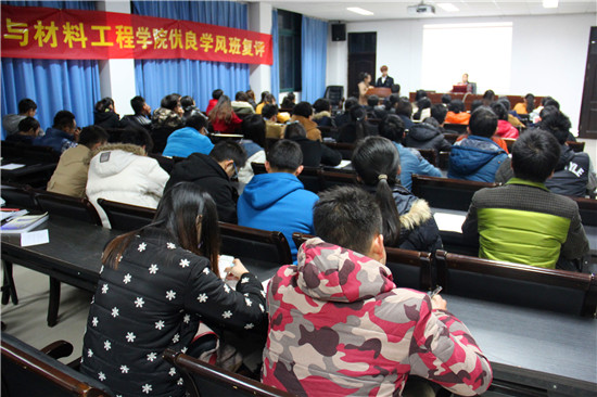 于化材楼11C-401举行了2014-2015年第一学期'优良学风班'评比复评环节。本次评比活动邀请了辅导员林萍老师、韩卓羽老师,以及李丹萍老师,院学生会主席李慧静、团副王慧敏、副主席周基政参加,各个班级的5位同学代表也作为大众评委参加了此次评比活动。