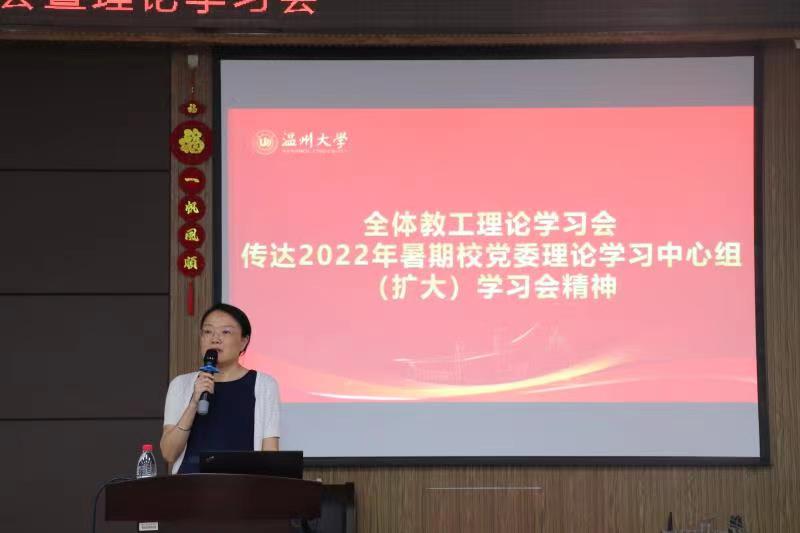 会议第五项,刘吟书记部署相关工作。刘吟书记代表学院领导班子对所有教职工送上节日的问候与祝福,感谢老师们一直以来的辛勤耕耘与默默付出。随后,她向广大教师传达了2022年暑期校党委理论学习中心组(扩大)学习会精神,并对校党委书记谢树华的《以现代化治理推动高质量发展》和校长赵敏的《面向“双一流”深入实施学科驱动战略 推动学校在新阶段实现高质量发展》主题报告进行了深入解读,对学院师德师风专题教育、疫情防控、社会培训、校友会以及防诈骗等工作进行了相应部署。