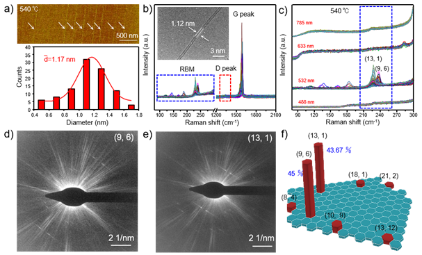 图3. (a)利用固体“特洛伊”催化剂在540°C下生长得到的SWNTs的AFM图(顶部)及其直径分布图(底部)。(b)532nm激发波长下蓝宝石衬底上生长的SWNTs的拉曼光谱表征。插图为540°C下生长的单根SWNT的TEM图。(c)在540°C下获得的SWNTs的多波长(488nm、532nm、633nm和785nm)拉曼光谱表征。(d)单根(9、6)管的电子衍射图(EDP)。(e)单根(13,1)管的电子衍射图(EDP)。(f)利用固体“特洛伊”催化剂在540°C下生长得到的SWNTs的手性物种含量相对丰度图。