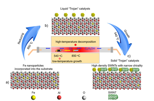图1. 利用固体“特洛伊”催化剂在低温下生长高密度手性SWNTs的示意图。