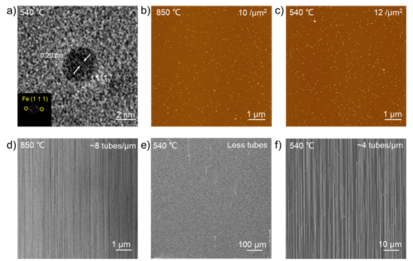 图2. (a)540°C下Fe催化剂的原位HRTEM图,显示了清晰的晶格条纹,表明其为固态且结晶良好。插图是相应的FFT衍射图,黄色圆圈标记的衍射点来自于Fe的(111)面。(b)850°C下直接获得的密度为10/μm2的液体“特洛伊”催化剂的AFM图。(C)在540°C下稳定数分钟的固体“特洛伊”催化剂的AFM图,固体“特洛伊”催化剂的获得是由850°C下获得的液体“特洛伊”催化剂转化而来,密度约为12/μm2。(d)利用液体“特洛伊”催化剂在850°C下直接生长的SWNTs的扫描电子显微镜(SEM)图。(e)利用固体“特洛伊”催化剂在540°C下直接生长的得到的SWNTs的SEM图。(f)利用固体“特洛伊”催化剂在540°C下直接生长得到的SWNTs的SEM图。