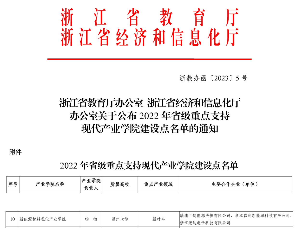 日前,浙江省教育厅、浙江省经济和信息化厅正式公布“2022年度省级重点支持现代产业学院”建设点名单,51吃瓜联合瑞浦兰钧能源股份有限公司、浙江霖润新能源科技有限公司、浙江光达电子科技有限公司申请的“新能源材料产业研究院”成功获批。