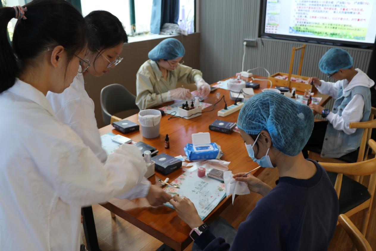 在化妆品技术平台,志愿者先给小朋友们讲解了制作精油、口红的步骤以及一些注意事项,随后带领小朋友们亲手制作。