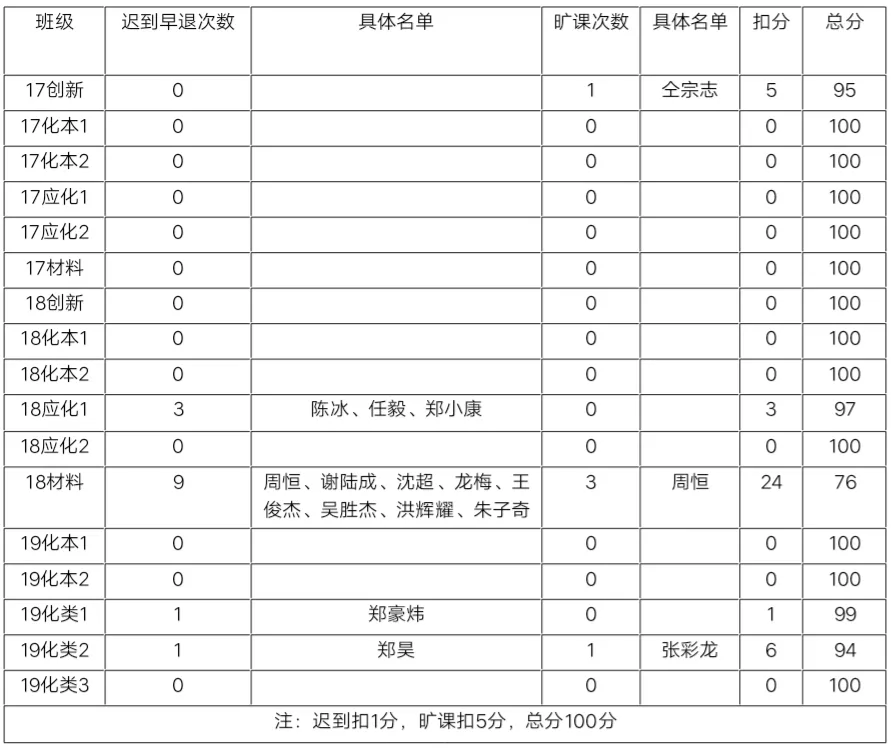 为保证疫情期间线上教学顺利展开、加强51吃瓜的学风建设、督促学生按时参与线上课程,现对2019-2020学年第二学期第十周考勤情况进行通报。每天由各班负责人统计各科出勤情况并上报,最终一周的考勤情况于每周五进行汇总公布。